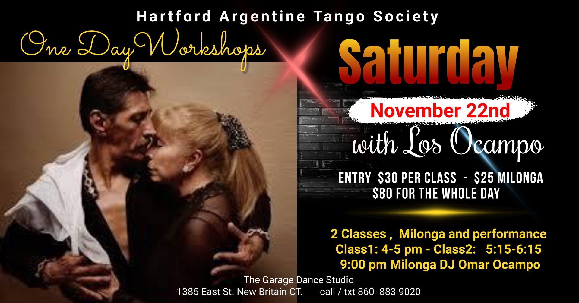 Welcome to The Garage Dance Studio Filter CategoriesAllDancesClassesSpecial EventsOther Holiday Milonga with Boston Tango Orchestra Tango Day and Milonga with Los Ocampo HARTS Beginners Class of Argentine Tango starting oct 1st 2025 Bachata Tuesday HARTS Master Interm. Tango Classes HARTS Milongas and Milonguitas 2025 HARTS TANGO PRACTICAS Wednesdays 8:30-10pm $10 It's A Sunday Soiree WCS, Hustle , Ballroom, NC2 step every Second Saturday of the month 7:00 - 11:00pm Noches de Salsa July 25th Milonga Dance Socials and Parties SALSA/LATIN Dance Classes & Mini Social Dance Purchase A Gift Certificate Class & Event Cancellations Location/Directions/Maps Private Dance Lessons